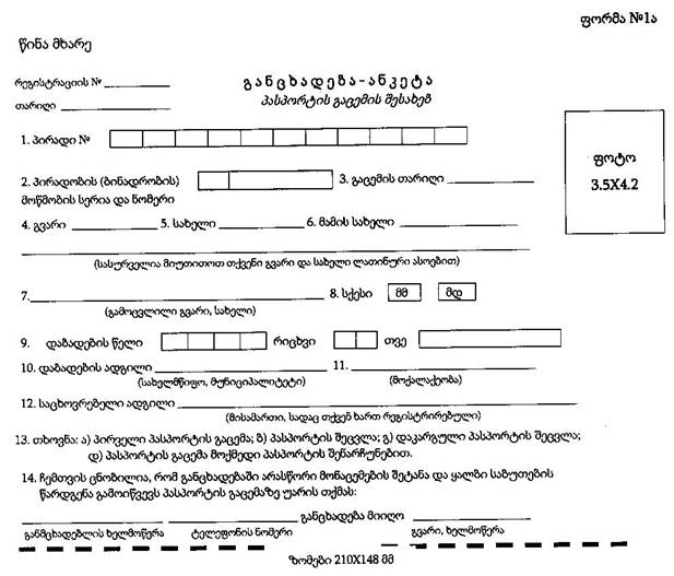 | 2. აღნიშვნები პასპორტის გაცემის შესახებ: გაფორმდა პასპორტი № __________________________ პასპორტი მივიღე: _______________________________ (მოქალაქის ხელმოწერა) ________________ „____“________________200____ წ. პასპორტი გასცა: ________________________________ (ხელმოწერა, გვარი) 3. პასპორტის გაცემაზე ეთქვა უარი საფუძველი: ___________________________________ ეცნობა: _______________________________________ (ტელეფონით, პირად მიღებაზე) –––––––––––––––––– „–––––”–––––––––––––200 ––– წ. |