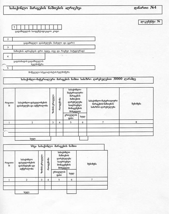დ) მე-4 უჯრაში – დეკლარაციის სახე. იმის მიხედვით , დეკლარაცია პირველადია თუ დაზუსტებული , შესაბამისი სტრიქონის ცარიელ უჯრაში კეთდება აღნიშვნა „V“ ნიშნით;