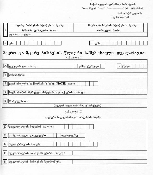 2. ინსტრუქცია „მიკრო და მცირე ბიზნესის სტატუსის მქონე პირების მიერ დეკლარაციის ფორმისა, მისი შევსებისა და წარდგენის წესი“ (დანართი №2) თანდართულ დანართთან ერთად.