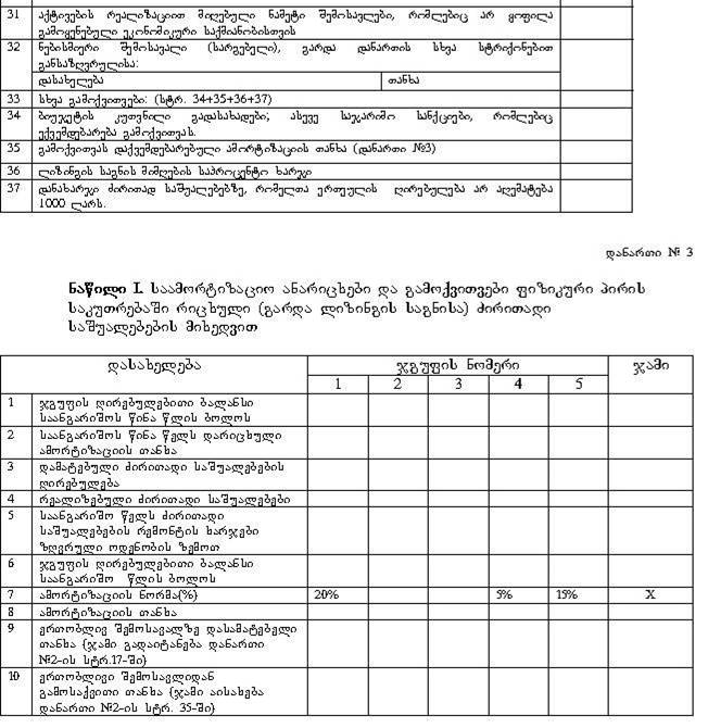 37. 37-ე სტრიქონში შეიტანება დანახარჯი ძირითად საშუალებებზე, რომელთა ერთეულის ღირებულება არ აღემატება 1000 ლარს.