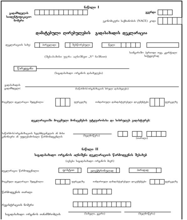 დეკლარაციის 11 და 181 უჯრები ივსება მხოლოდ იმ გადასახადის გადამხდელის მიერ, რომელსაც საქართველოს საგადასახადო კოდექსის 292-ე მუხლის პირველი ნაწილის „გ“ ქვეპუნქტის საფუძველზე გაუფორმდა საგადასახადო შეთანხმება.“.