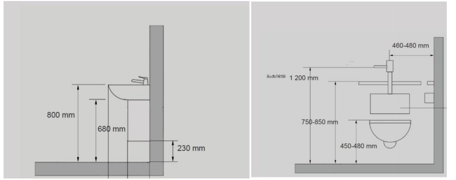 3. სანიტარიული კვანძები უნდა იყოს: ა) დაცული მზის პირდაპირი სხივისაგან, განსაკუთრებით, შედარებით ცხელ რეგიონებში; ბ) ტუალეტის კაბინის კარი გარეთ უნდა იღებოდეს, უნდა იყოს აწეული იატაკის დონიდან და იკეტებოდეს შიგნიდან, თუმცა ასევე უნდა ითვალისწინებდეს გაღების შესაძლებლობას გარედან, უსაფრთხოების მიზნით; გ) ბიჭებისთვის განკუთვნილ საპირფარეშოებში შესაძლებელია იყოს გათვალისწინებული პისუარები, გამოყოფილი ერთმანეთისაგან პანელების საშუალებით; დ) იატაკის საფარი უნდა იყოს დამზადებული მოცურების საწინააღმდეგო მასალით, რომელიც შეინარჩუნებს თავის თვისებებს სველ მდგომარეობაშიც. დაუშვებელია გრანიტი, მარმარილო ან სხვა ანალოგიური მასალები იატაკებისათვის; ე) სანიტარიული კვანძის კედლები მოპირკეთებული უნდა იყოს კერამიკული ფილებით იატაკიდან არანაკლებ 1.5 მ-ის სიმაღლეზე ან დამუშავდეს წყალმედეგი საღებავით, რომელიც დაექვემდებარება სველი წესით წმენდასა და დეზინფექციას. 4. ადრეული და სკოლამდელი აღზრდისა და განათლების დაწესებულების ტუალეტებში უზრუნველყოფილი უნდა იყოს პრივატულობა და დაცულობა. 5. სანიტარიული კვანძის ფართობი გამოითვლება ერთ ბავშვზე 0,15 მ2-ის გადაანგარიშებით. 6. ადრეული და სკოლამდელი აღზრდისა და განათლების დაწესებულების შენობაში უნდა იყოს განთავსებული არანაკლებ ერთი ტუალეტისა შეზღუდული შესაძლებლობის მქონე ბავშვებისთვის, რომლის მინიმალური ზომები უნდა იყოს: ა) 122 × 142 სმ (როცა შესვლა ხდება განივი მხრიდან); ბ) 122 × 167 სმ (როცა შესვლა ხდება გრძივი მხრიდან); გ) უნიტაზის სიმაღლე უნდა იყოს 45-48 სმ; დ) ეტლიდან უნიტაზზე გადასაჯდომად განკუთვნილი მოაჯირები, რომლებიც დამონტაჟებული იქნება კედელზე და განთავსდება 90 სმ-ის სიმაღლეზე იატაკის დონიდან (სქემა №2). 7. ადრეული და სკოლამდელი აღზრდისა და განათლების დაწესებულების სანიტარიული კვანძი უნდა იქნეს მოწყობილი შემდეგი გაანგარიშებით: ა) 1 უნიტაზი − ყოველ 10-12 გოგონაზე; ბ) 1 უნიტაზი − ყოველ 10-20 ბიჭზე და 1 პისუარი ყოველ 20 ბიჭზე; გ) 1 ხელსაბანი ნიჟარა − ყოველ 20 ბავშვზე. 8. ხელსაბანი ნიჟარები სანიტარიულ კვანძებში უნდა იყოს განთავსებული 555 მმ-ის სიმაღლეზე.