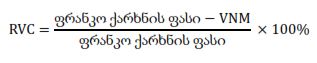 სადაც: RVC არის რეგიონალური ღირებულების მინიმალური მოთხოვნა, რომელიც გამოხატულია პროცენტებში; VNM არის წარმოშობის სტატუსის არმქონე მასალების ღირებულება.