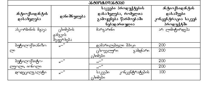 | საკვები დანამატის დასახელება | საკვები დანამატის დანიშნულება | პროდუქტის დასახელება | დასაშვები კონცენტრაცია (მგ/კგ) |