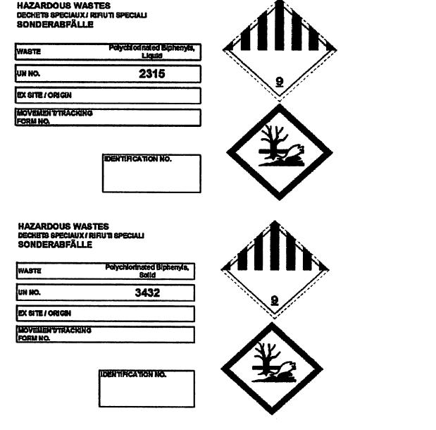 შენიშვნა: კლასი 9-ის პიქტოგრამა შესულია UN-ის სტანდარტულ რეგულაციებში, მაგრამ არ არის შეტანილი GHS სისტემაში (გლობალური ჰარმონიზებული სისტემა), საშიშროების ტიპის გამო. GHS სისტემაში საშიშროების ბუნება განისაზღვრა ისე, რომ კლასი 9-ის მრავალი მასალა შეტანილია სხვა უფრო სპეციფიკურ კლასებში. მიუხედავად ამისა, ეტიკეტები მაინც იგივეა, რაც სახიფათო ტვირთის ტრანსპორტირების რეგულაციებში. GHS სისტემა ეხება მხოლოდ მასალის შეფუთვას, ხოლო ნარჩენების შემთხვევაში არსებობს გარკვეული გამონაკლისები. ეს გამონაკლისები გულისხმობს ნაკლებად მკაცრ რეგულაციებს მასალების ზუსტ შემადგენლობებთან დაკავშირებით. (UN-ის ნომერი პქბ კონდენსატორისთვის არის UN 2315). საზღვაო გადაზიდვის კონტეინერის იდენტიფიკაცია განსხვავებულია. ასეთი გზავნილებისთვის გამოყენებული უნდა იქნეს IMDG (საერთაშორისო კოდექსი „სახიფათო ტვირთების საზღვაო გადაზიდვის შესახებ“). შეფუთვაზე, გარდა UN ნომრისა, მითითებული უნდა იყოს გადაზიდვის სახელი (პქბ) და მინიშნებები შემადგენლობაზე (თხევადი, მყარი). კონტეინერზე მიმაგრებული უნდა იყოს კლასი 9-ის ეტიკეტი და ასევე საზღვაო დაბინძურების იარლიყი. 2009 წლიდან საზღვაო დამაბინძურებლების ახალ ეტიკეტზე გამოსახულია მკვდარი ხე და მკვდარი თევზი.