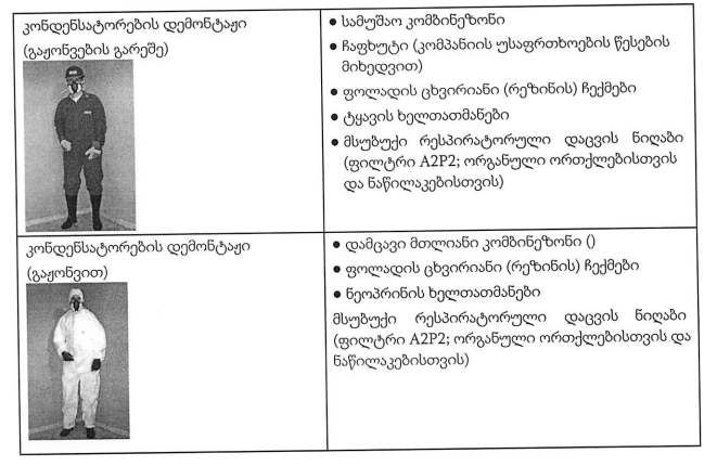 - ქიმიური ნივთიერებებისგან დამცავი კომბინეზონი; - ქიმიური ნივთიერებებისგან დამცავი ხელთათმანები; - ჩექმები, ან ფეხსაცმელზე ერთჯერადი გადასაცმელი.