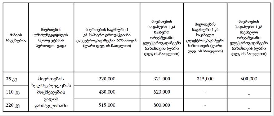 დანართი №12 ელექტროენერგიის გადამცემ ქსელზე მიერთების მეორე ეტაპის ვადა და საფასური გადაცემის ლიცენზიატის გადამცემ ხაზში შეჭრის შემთხვევაში