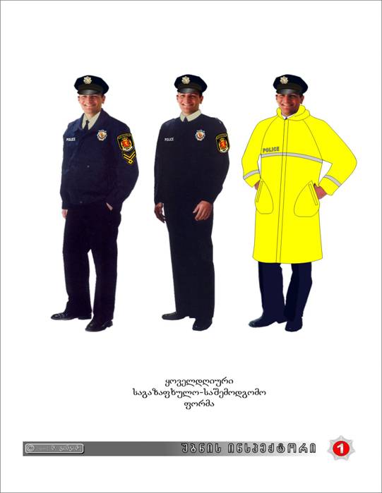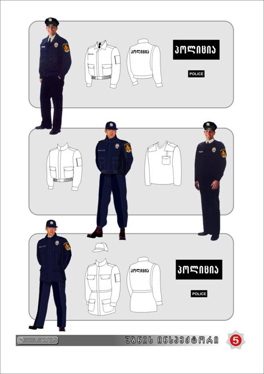 1. ყოველდღიური საგაზაფხულო-საშემოდგომო ფორმა – დათბუნებული ქურთუკის კონტურული ნახაზი. წარწერა ორ ენაზე: ,,პოლიცია“; ,,პოლიცე“.