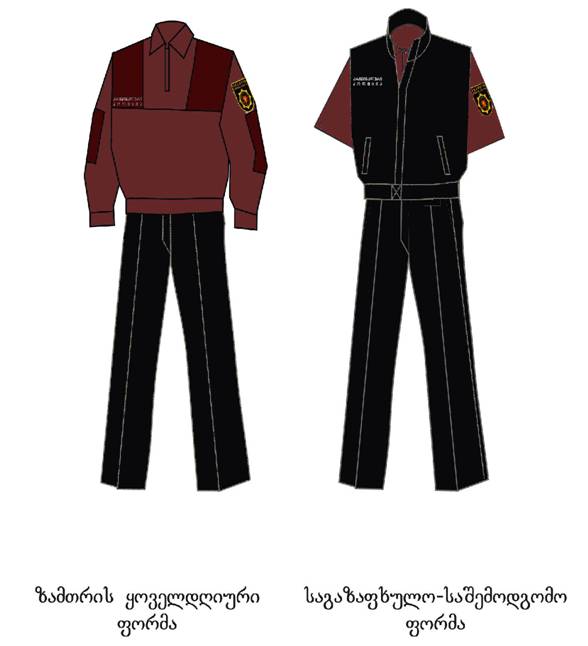 2. საგაზაფხულო-საშემოდგომო ფორმა – შავი ფერის შარვალი. მუქი წითელი (შინდისფერი) სვიტერი; შავი ფერის ჟილეტი; შავი ფეხსაცმელი.