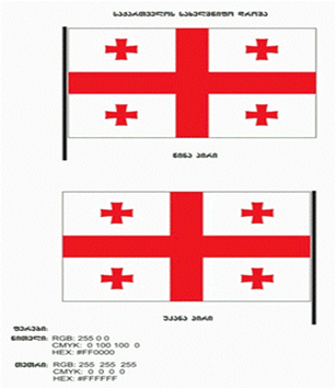 ����������� 1. Государственный флаг Грузии представляет собой прямоугольное белое полотнище, в центральной части которого изображен большой крест красного цвета с прямыми углами, соединенный с четырьмя сторонами флага. В четырехугольниках, разделенных вертикальной и горизонтальной полосами креста, изображены четыре болнисско-кацхских креста того же цвета.