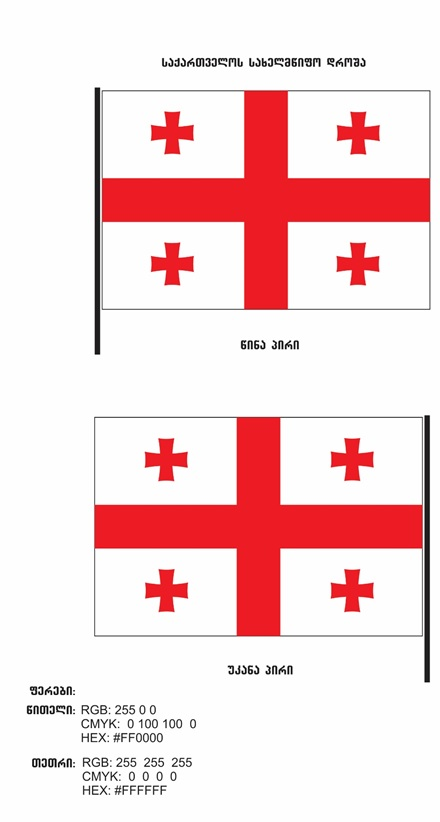 ეს კანონი საქართველოს კონსტიტუციის მე-2 მუხლის მე-4 პუნქტის თანახმად ადგენს საქართველოს სახელმწიფო სიმბოლოებს − საქართველოს სახელმწიფო დროშას, საქართველოს სახელმწიფო გერბს და საქართველოს სახელმწიფო ჰიმნს. მუხლი 2. საქართველოს სახელმწიფო დროშა 1. საქართველოს სახელმწიფო დროშა არის მართკუთხა თეთრი ფერის ქსოვილი, რომლის ცენტრალურ ნაწილში გამოსახულია დროშის ოთხივე გვერდთან დაკავშირებული სწორკუთხა წითელი ფერის დიდი ჯვარი. ჯვრის ვერტიკალურ-ჰორიზონტალური მკლავებით გამოყოფილ ოთხკუთხედებში გამოსახულია ოთხი იმავე ფერის ბოლნურ-კაცხური ჯვარი. 2. საქართველოს სახელმწიფო დროშის გამოსახულება და სტანდარტული ზომები განისაზღვრება ამ კანონის №1 და №2 დანართებით. მუხლი 3. საქართველოს სახელმწიფო გერბი 1. საქართველოს სახელმწიფო გერბი გამოისახება სახელმწიფო გერბის ფორმითა და მცირე სახელმწიფო გერბის ფორმით. 2. სახელმწიფო გერბი არის ჰერალდიკური ფარი, რომლის მეწამულ ველზე გამოსახულია ოქროს ჯვრის ბუნიანი ვერცხლის შუბოსანი, ვერცხლის გველეშაპის განმგმირავი, ვერცხლის ცხენზე ამხედრებული, ოქროს შარავანდედიანი ვერცხლის მხედარი – წმინდა გიორგი. ფარი დაგვირგვინებულია ივერიული (ქართული) გვირგვინით. ფარისმტვირთველი ორი ოქროს ლომი ვაზის სტილიზებული ორნამენტის საფუძველზე დგას. საფუძველზე გადმოფენილია ვერცხლ-მეწამული სადევიზე ბაფთა (ავერსი – ვერცხლი, რევერსი – მეწამული). ბაფთის ვერცხლის ველზე სევადისფერი ქართული მხედრული ანბანით წარწერილია დევიზი: „ძალა ერთობაშია“. ბაფთაზე, სადევიზე წარწერის თავსა და ბოლოში, გამოსახულია მეწამული ჰერალდიკური ჯვრები. 3. მცირე სახელმწიფო გერბი არის ჰერალდიკური ფარი, რომლის მეწამულ ველზე გამოსახულია ოქროს ჯვრით დაბოლოებული ვერცხლის შუბით ვერცხლის გველეშაპის განმგმირავი ვერცხლის მხედარი – წმინდა გიორგი ოქროს შარავანდედით. ფარზე ივერიული (ქართული) გვირგვინია. 4. სახელმწიფო გერბისა და მცირე სახელმწიფო გერბის გამოსახულებები განისაზღვრება ამ კანონის №3 დანართით. მუხლი 4. საქართველოს სახელმწიფო ჰიმნი საქართველოს სახელმწიფო ჰიმნის ტექსტი და მუსიკა განისაზღვრება ამ კანონის №4 და №5 დანართებით. მუხლი 5. კანონის ამოქმედება ეს კანონი ამოქმედდეს საქართველოს პრეზიდენტის მომდევნო არჩევნებში არჩეული საქართველოს პრეზიდენტის მიერ ფიცის დადებისთანავე. |