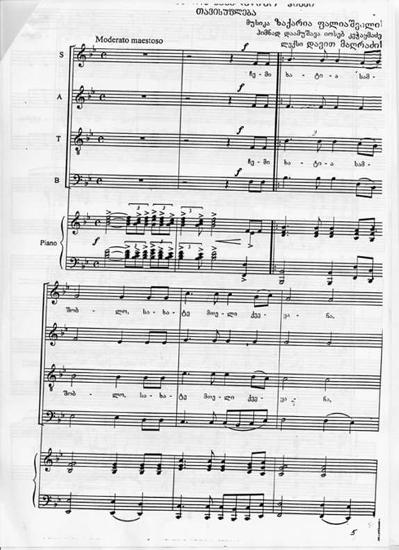 ჩემი ხატია სამშობლო, სახატე მთელი ქვეყანა, განათებული მთა-ბარი, წილნაყარია ღმერთთანა. თავისუფლება დღეს ჩვენი მომავალს უმღერს დიდებას, ცისკრის ვარსკვლავი ამოდის და ორ ზღვას შუა ბრწყინდება, დიდება თავისუფლებას, თავისუფლებას დიდება.