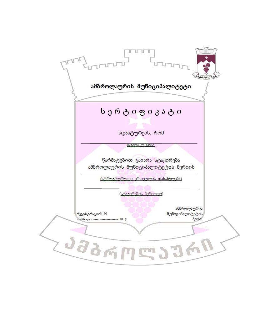 ამბროლაურის მუნიციპალიტეტის მერიაში სტაჟირების გავლის დამადასტურებელი მოწმობის –