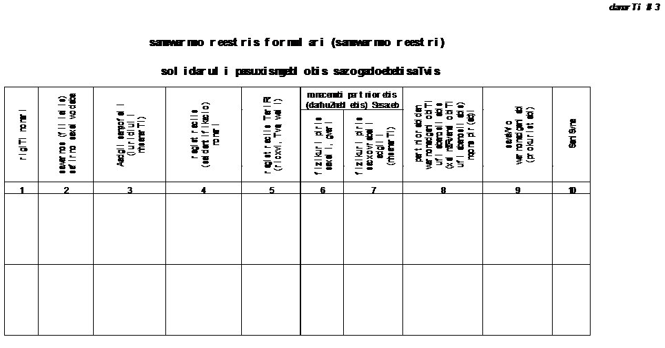 თ) მე-10 სვეტში – ფიზიკური პირის პირადობის დამადასტურებელ დოკუმენტში ფიქსირებული პირადი ნომერი (საქართველოს მოქალაქის შემთხვევაში, რომელიც მის პირველადი რეგისტრაციის შემთხვევაში წარმოადგენს მის საიდენტიფიკაციო ნომერს);